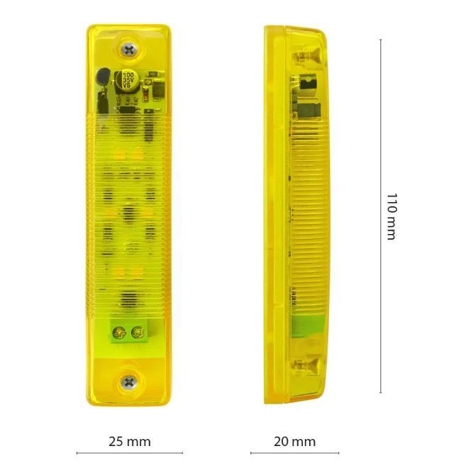 Bezpečnostní LED modul blikající - svítící mini žlutý. Výška 110 x 25 x 20 mm. Připojení pro svícení 12-24 Vdc a pro blikání 12-30 Vdc, 1,5W.